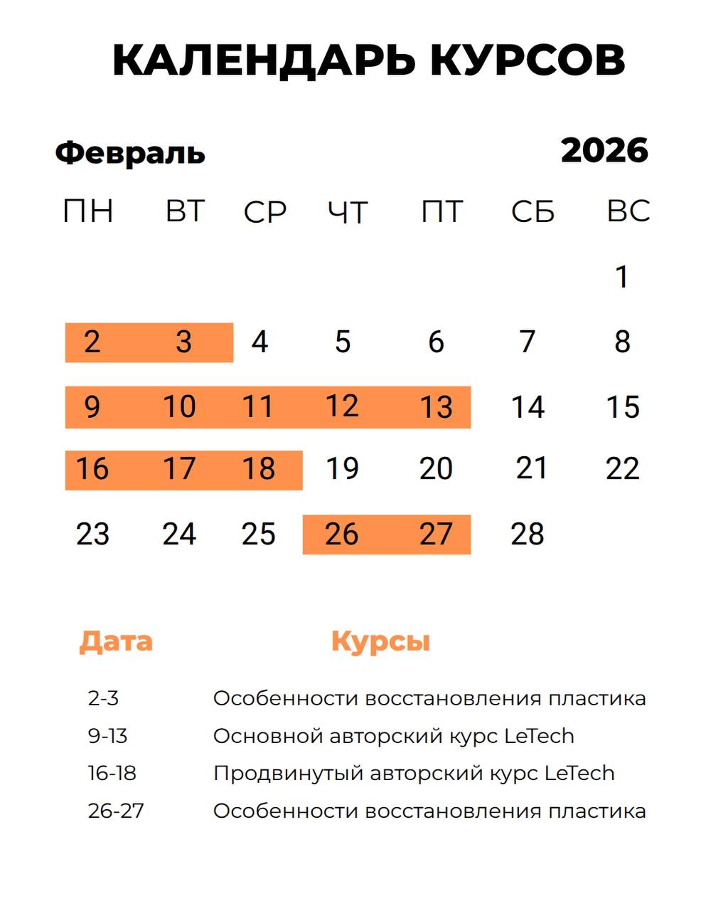 РАСПИСАНИЕ КУРСОВ НА ФЕВРАЛЬ.